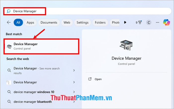 Click the Start menu icon and search for Device Manager, then select Device Manager from the search results.