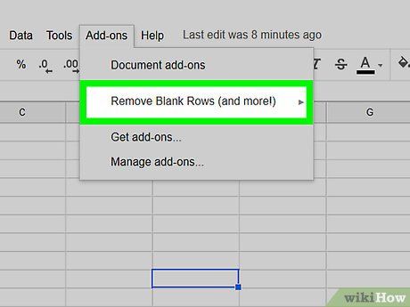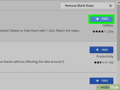 Click on + Free (+ Free). This button is located next to the name "Remove Blank Rows (and More)." The add-on features an eraser icon.