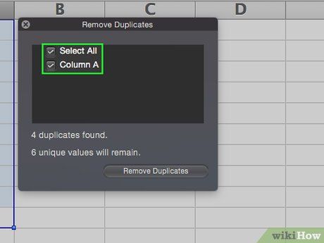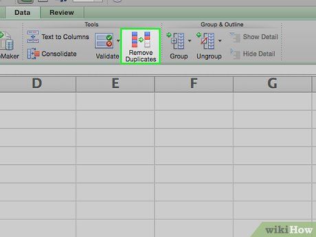 Click on Remove Duplicates. This option is found in the "Data Tools" section of the Data toolbar near the top of the Excel window. A pop-up window will appear, allowing you to select or deselect columns.