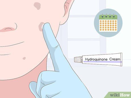 Apply hydroquinone cream to lighten stubborn sunburn marks. Hydroquinone is another over-the-counter cream used to treat dark or widespread sunburn spots. Wear latex gloves before application. Dab a small amount of the bleaching cream directly onto each sunburn mark and use a gloved finger to gently massage it into the skin. Apply daily or as directed on the packaging until the marks lighten significantly.