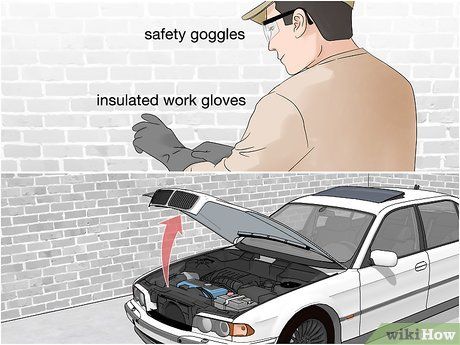 Wear protective gear and open the hood. The car battery contains sulfuric acid electrolyte, a corrosive substance that can burn skin and release highly flammable hydrogen gas. It's essential to wear insulated gloves and safety goggles for protection. Open the hood and prop it up with a hood support rod if necessary.