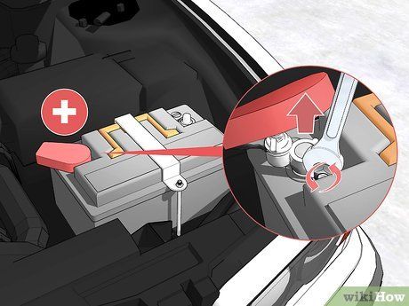 Next, disconnect the positive cable and secure it in place. The positive terminal is usually red and marked with a plus (+) symbol. Remove any plastic cover if present, then loosen the positive cable clamp with a wrench and pull the cable off the terminal. Secure the cable in the engine compartment.