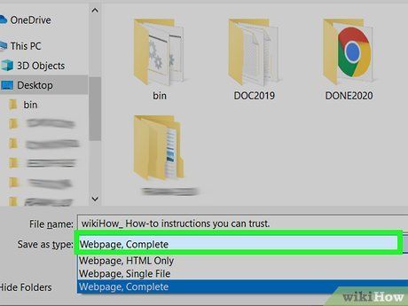 Select whether you want to save the full page or just the HTML language. In the "Save as type" menu, you can choose between "Webpage, Complete" or "Webpage, HTML Only". Choosing to save the complete page will download all multimedia content into a separate folder. This way, you can view images offline.