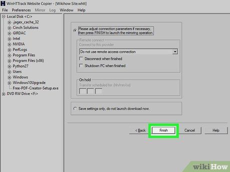 Click the "Finish" or "Start" button to begin copying the website. The progress bar will appear once HTTrack starts downloading the entire website content. This process can take a considerable amount of time, especially for large websites or slow connections.