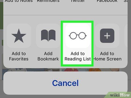 Tap the "Add to Reading List" button from the Share menu. The "Add to Reading List" button has a glasses icon and is located next to the "Add Bookmark" option.