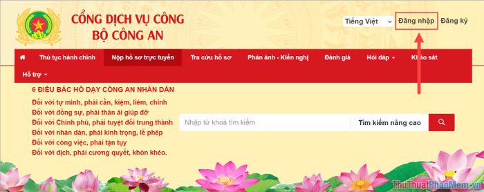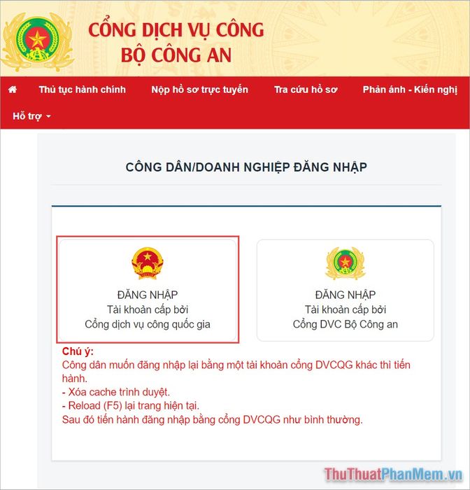 Step 1: Go to the Ministry of Public Security's Public Service homepage and select Login to log in using the CCCD/phone number registered on the citizen ID account.
