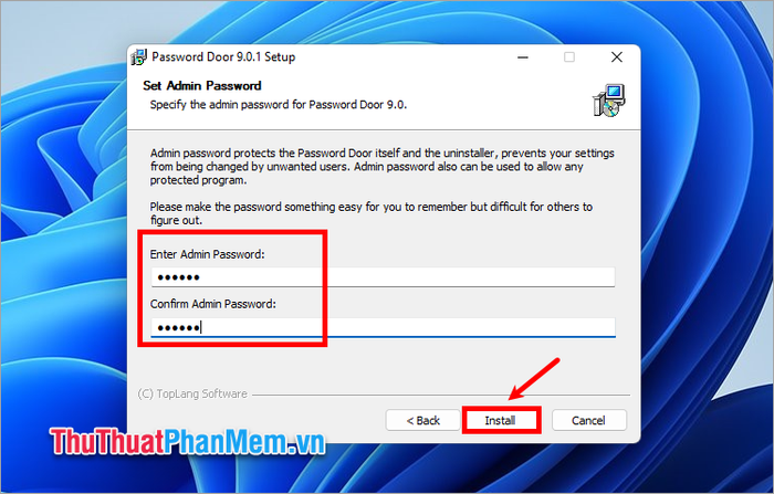 In the Set Admin Password section, set your access password for Password Door in the Enter Admin Password field, then confirm the password in the Confirm Admin Password field and click Install.