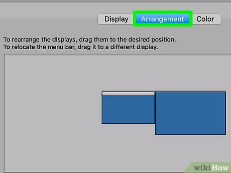 Change the default display. To make the second screen your main display, click and drag the white rectangle located above one of the blue screens and move it to the second screen.