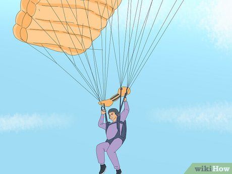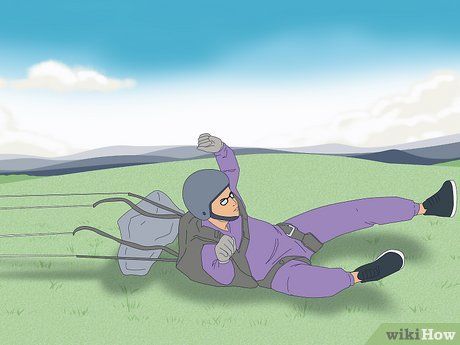 Steer with the cables and prepare for landing. Check that your reserve parachute has deployed successfully and get ready to land. You’ll have less time to prepare, so executing the landing properly is essential. To assume the correct position, point your feet toward the ground, keeping your heels up, and prepare to absorb the impact with your legs. Use the left and right steering cables to guide your descent, and look for a safe landing area, like an open field. Avoid landing near cliffs or hazardous obstacles such as power lines.