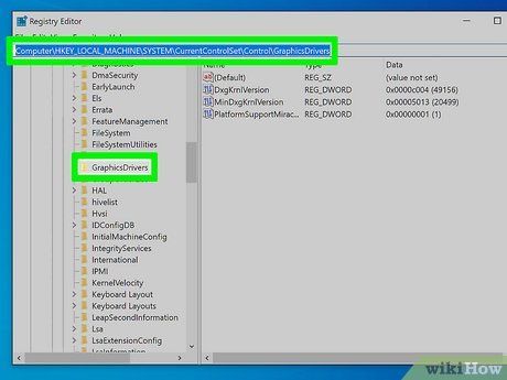 Navigate to HKEY_LOCAL_MACHINE\System\CurrentControlSet\Control\GraphicsDrivers. A simple way to do this is to copy the address, paste it into the address bar at the top of the Registry Editor, and press Enter. Alternatively, you can access it step by step as follows:
