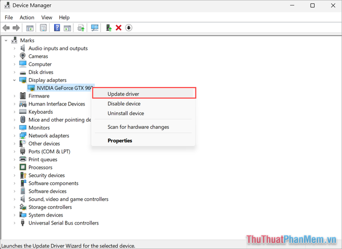 Step 3: Next, right-click on the graphics card currently installed on your computer and select Update Driver to update the graphics card driver on your computer.