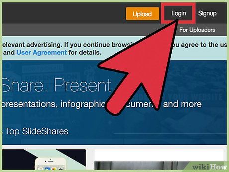 Click on “Login” and sign in to SlideShare. You’ll find this link at the top right corner of the website. Enter your login details in the blank fields, or click “Login with LinkedIn” to sign in using your LinkedIn account.