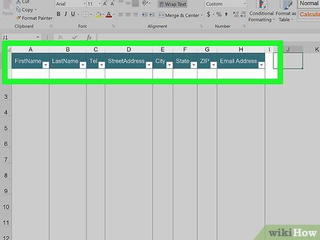 Enter contact headers. Proceed by filling in the following headers into their respective cells, starting from cell A1 moving to the right: