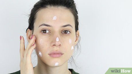 Dab the moisturizer onto certain areas of your face. Using your dominant hand’s two fingers, dab moisturizer onto areas that are prone to dryness, such as your forehead, cheeks, nose, chin, and neck.