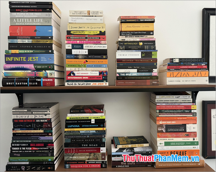 In addition to vertical stacking where books are arranged upright, you can also stack them horizontally. You can organize the stacks by genre, color, or size based on your preferences. Each neat and orderly stack creates a clean, simple look, making this another easy and attractive way to arrange your books.