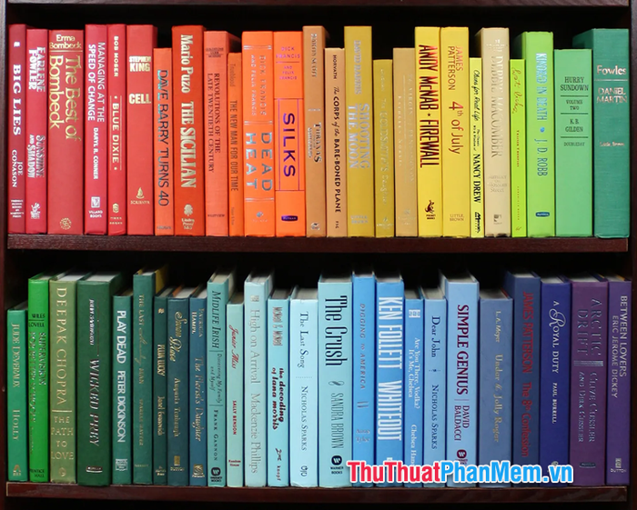 Arranging books by color is one of the simplest and most beautiful ways to display them. This method is easy to implement; you can organize your books based on your preferred color scheme, such as following the order of the rainbow, arranging them from dark to light (ombre style), or simply grouping them by similar colors. With this simple yet effective book arrangement, there's no need for additional decorative items to make a statement— the colors of the books themselves will make your bookshelf stand out.