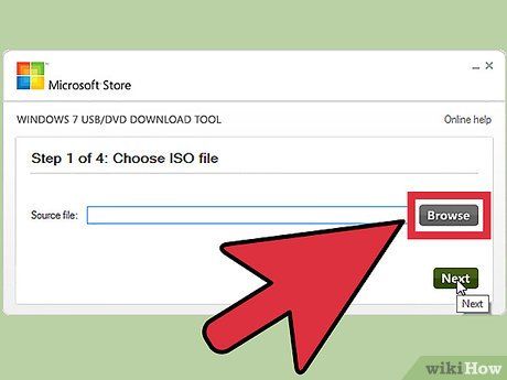 Select the ISO. In the Step 1 of 4: Choose ISO file screen of the Windows 7 USB/DVD Download Tool, select the downloaded ISO file by clicking Browse, then click Next to continue.