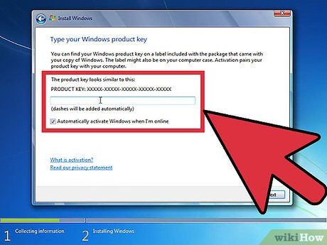 Input the product key and click Next. The product key is located on the Windows 7 disc case if you purchased a physical copy. To skip this step, click Next, but note that Windows will only be usable for a 30-day trial period, after which the key must be entered.