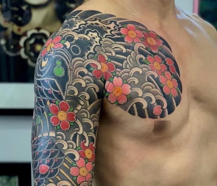 Beautiful Japanese arm sleeve and chest tattoos
