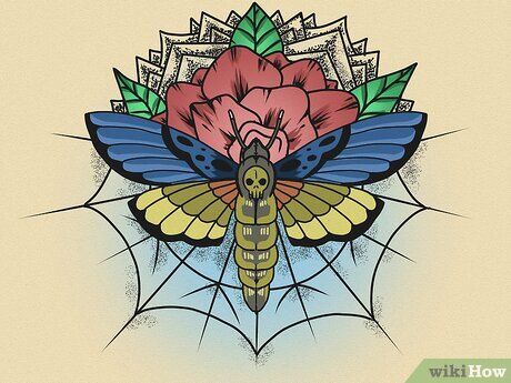 Collage designs Add other elements like flowers, animals, hearts, arrows, or text around the death moth to form a unique collage tattoo. Work with your tattoo artist to carefully arrange the elements so the death moth remains the focal point while still maintaining a visually engaging backdrop or composition.