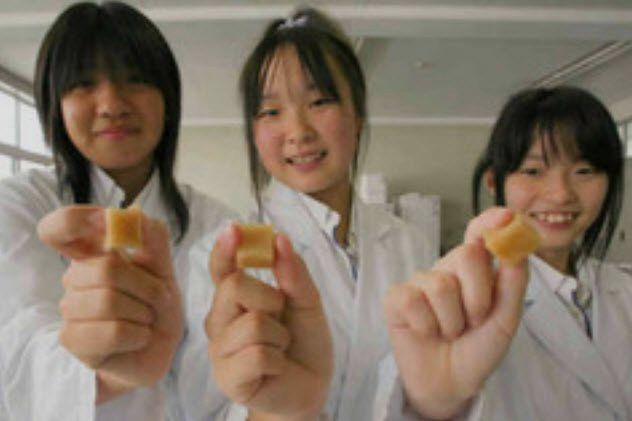 Students from Obama Fisheries High School in Obama, Japan, boiled the troublesome jellyfish to create a paste, then ground it into fine particles. They combined this jellyfish powder with sugar and starch syrup to craft a sweet-and-salty treat: jellyfish caramels.