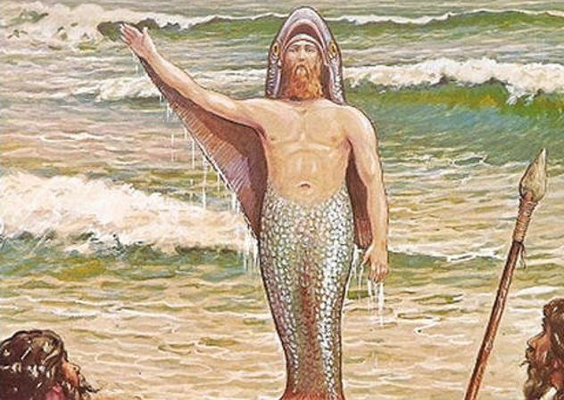 In Babylonian mythology, Oannes was an amphibious deity resembling a merman with a long beard, wearing a fish-shaped hood. Some depictions show him as if a man had hollowed out a giant fish and worn it like a suit, walking upright on land. Other illustrations include human feet protruding from the fish, making him appear less like a mythical creature and more like an eccentric individual.