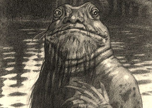 Depictions of Vodyanoy show a human-like body with webbed hands and a frog-like head featuring a human nose. His beard was often covered in algae and slime. Legends say he could transform into a human to indulge in human food, which people offered to him. Despite his shape-shifting abilities, he could be identified by the constant dripping of water from his left buttock.