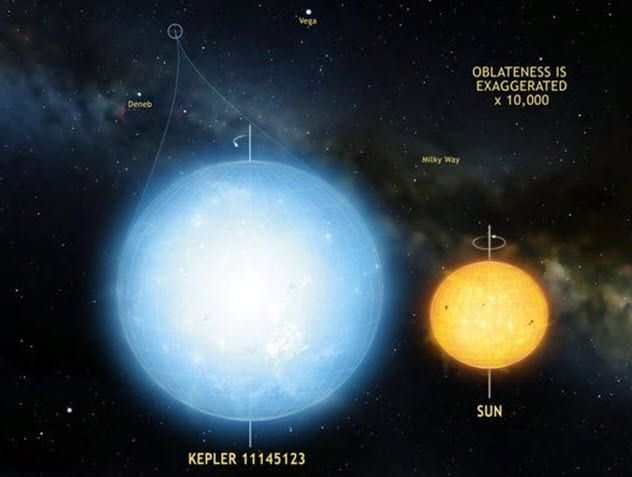 Earth’s equator is 21 kilometers (13 miles) wider than its poles. By comparison, the Sun’s equator is about 10 kilometers (6 miles) wider, and Kepler 11145123 has an equatorial bulge of only 6 kilometers (4 miles). This is especially impressive considering that Kepler 11145123 is twice the size of the Sun.