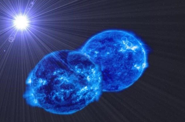 The larger star has a mass 38 times that of the Sun, while the smaller star weighs 32 times as much as our Sun. Later on, astronomers discovered that these stars will eventually collide and form a colossal stellar entity with a mass 60 times that of the Sun.