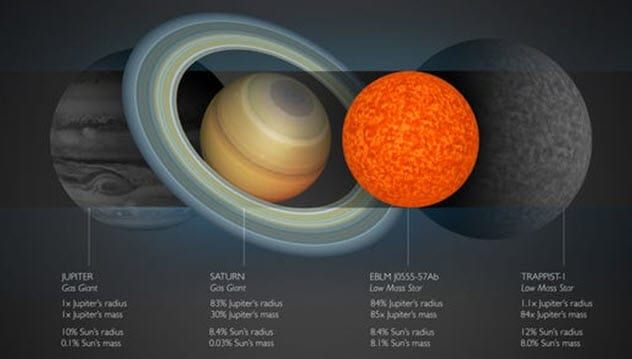 If EBLM J0555-57Ab were any smaller, it would lack the internal pressure necessary for nuclear fusion to take place. As we discussed earlier, nuclear fusion is the process that generates the heat and light that stars emit. This star's size is perfectly suited to meet the minimum mass threshold required for nuclear fusion. If it were any smaller, it would have been classified as a brown dwarf—a type of failed star that doesn't have enough mass for gravity to initiate nuclear fusion.