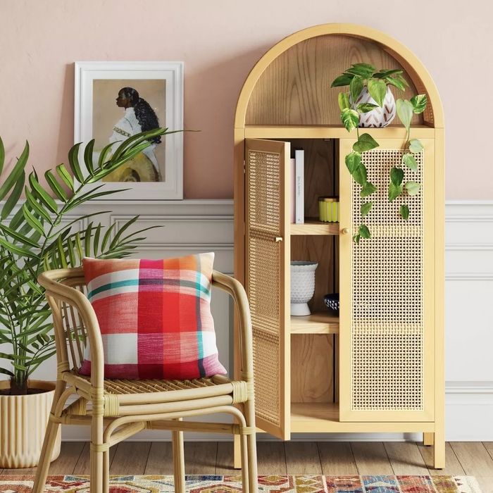 7. An arched wood cabinet that's both practical and gorgeous. I adore it because it allows you to conceal any clutter while still looking beautiful.