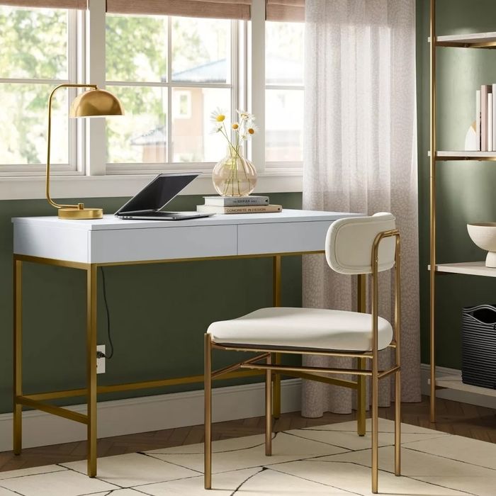 8. A writing desk with drawers and charging station, so you can charge while on that Zoom call that should have been an email. Charming and simple, this would easily slide into anyone's pre-existing office decor.