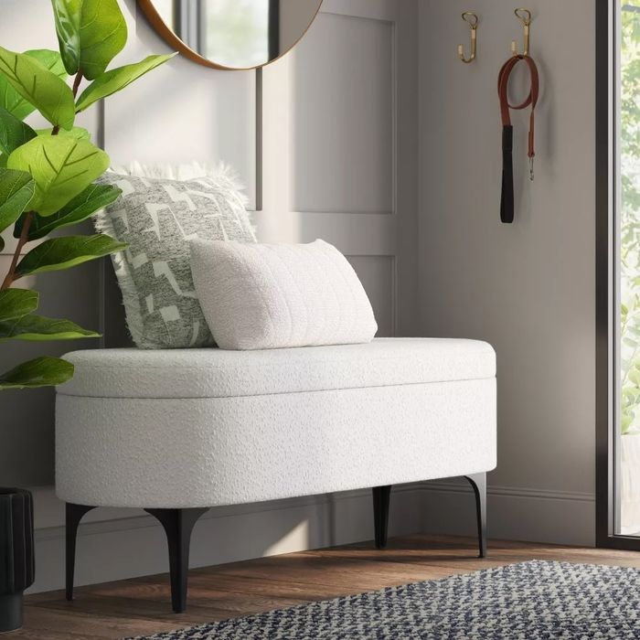 12. This elevated storage bench brings a fresh, clean look to your space. The bonus? It’s soft to the touch, making it a cozy spot for you or your pet, even if it's just for slipping on your shoes.