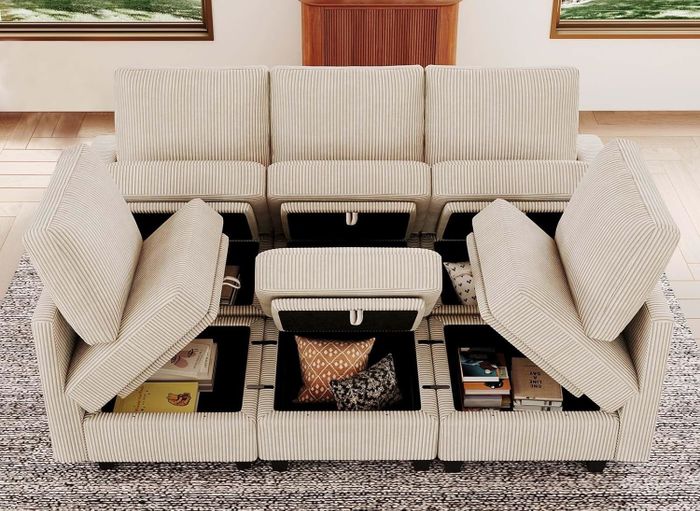 11. This six-piece sectional can be reconfigured into various shapes (including an L-shaped layout!) simply by rearranging the pieces. Additionally, each section offers convenient storage space beneath the seats.