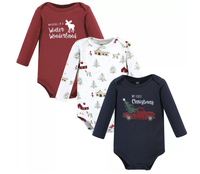 23. A trio of bodysuits, so when your baby inevitably spits up all over their "First Christmas" outfit you'll have various festive options to change 'em into.