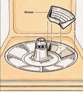 The strainer sits directly beneath the lower sprayer arm. If it becomes clogged with food particles and detergent, it can cause the dishwasher to flood or overfill. Some dishwashers have a strainer made of two semicircular halves, either plastic or metal. To remove this type, simply pry it up. In other models, the strainer is a single piece. For these, remove the cap that holds the sprayer arm in place, then remove both the arm and the strainer.