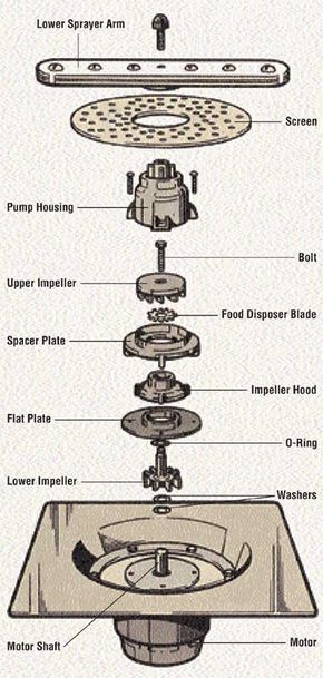 Step 2: Take off the sprayer arm, the screen, the pump housing, a bolt, the upper impeller, the food disposer blade, a spacer plate, the impeller hood, a flat plate, an O-ring, and the lower impeller. Organize the parts in the order they come off so you can easily reassemble them later.