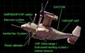The Osprey is equipped with multiband radios (AM, FM, UHF, VHF) for voice communication and radio reception. It also includes navigational beacons, radar altimeters, and an internal intercom/radio system that enables communication between the crew and onboard troops.