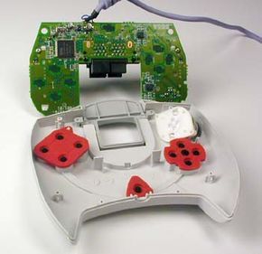 Each button can be customized to trigger a unique action, but all buttons, excluding the two analog triggers and joystick, operate similarly. Essentially, each button acts as a switch that completes a circuit when pressed. A metal disk beneath the button makes contact with two conductive strips on the controller’s circuit board. When this contact is made, the electricity flows between the strips. The controller detects this and sends the data to the Dreamcast. The CPU then compares the data with the game’s programming and activates the corresponding action. Similarly, there’s a metal disk under each arm of the directional pad. If pressing down on the pad makes the character crouch in a game, this interaction triggers a sequence that leads to the crouching action.