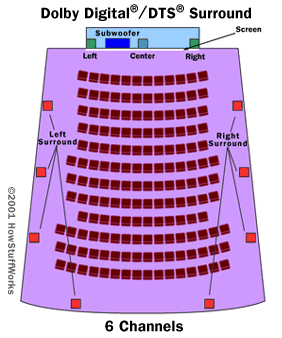 In this system, six distinct audio channels are encoded onto one or two CDs. The theater is outfitted with a CD player and a decoder that separates these channels and sends them to various speakers placed around the theater. Like Dolby Stereo, DTS includes three front channels and a subwoofer. However, instead of a single surround channel, it features individual channels for speakers located on the left and right sides of the theater.