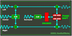 A surround-sound decoder takes both streams A and B and adjusts them in relation to each other, ensuring the surround signals are once again in phase. This adjustment causes the right, left, and center signals to become out of phase, leading them to cancel each other out.