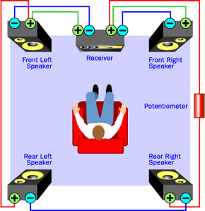 Another essential component for this setup is a potentiometer, a device that can adjust the resistance in a circuit, reducing the voltage. In this surround-sound arrangement, the potentiometer functions as a volume control for the rear speakers. You can place it anywhere along the circuit leading to the rear speakers. For more detailed guidance on building this type of custom system, refer to Chris Kantack's Surround Sound Information Source.