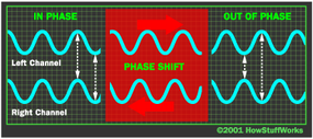 The sound information for the surround channel is recorded in both streams A and B, but in this case, the signals are out of phase with each other. Instead of playing synchronously, the signals in both streams are slightly shifted in time. This causes them to cancel each other out: As the signal in stream A pushes the left speaker cone outward, the signal in stream B pulls the right speaker cone inward. Consequently, the surround signal from the front left and right speakers largely cancels out, and you don't perceive it.