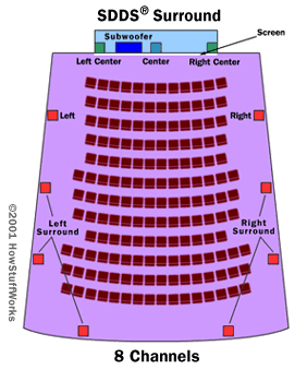 The latest innovation in digital cinema sound is Sony Dynamic Digital Sound® (SDDS), which provides five distinct audio channels at the front of the theater, along with left and right surround channels, totaling eight channels, including the subwoofer.