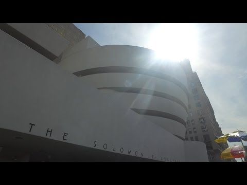 The exterior of the Solomon R. Guggenheim Museum features a small red tile bearing Frank Lloyd Wright's initials. Wright, the building’s architect, designed the iconic spiral ramp gallery that rises from the ground floor. The museum is home to global sister sites and displays works such as Georges Braque's 'Violin and Palette,' Juan Gris' 'Houses in Paris,' and Paul Klee's 'Red Balloon.'