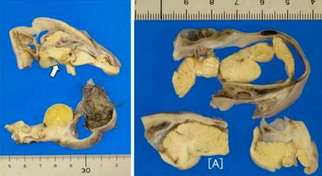 The mass measured around 10 centimeters (3.9 in) and had a bunch of hair, bone, and a deformed brain. The girl’s egg cell had started dividing for no reason and developed hair follicles. Some of the cells turned into a tiny partial brain and wrapped it with a bony layer. Luckily, as in this case, teratomas are mostly benign and easily removable.