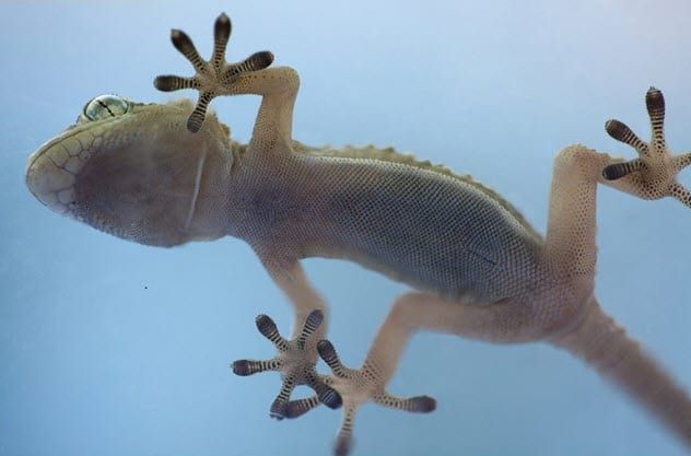 Naturally, geckos are not sticky creatures. Yet they effortlessly climb walls and hang upside down. They achieve this by using the hair on their toes. Each toe is covered in microscopic hairs, split into hundreds of fine bristles. This fuzz is the key.