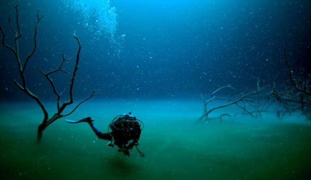 The halocline is so foggy that you can't see through it without a light. It’s also toxic. Not only does it serve as a natural divider between fresh and saltwater, but it also acts as a pseudo-seabed for the freshwater portion, preventing lighter objects from sinking through to the saltwater below.