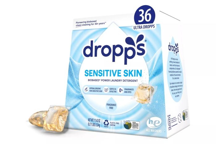 Dropps Sensitive Skin & Baby Detergent Pods are free from fragrance, dyes, enzymes, phosphates, parabens, phthalates, and optical brighteners. Each package is made of compostable cardboard, manufactured in the U.S., and offers a convenient subscription option with carbon-neutral shipping when ordered directly through the brand’s website.