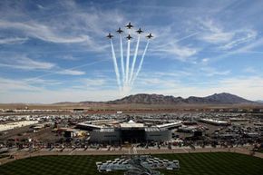 Despite regulations prohibiting flyovers at sporting events, they frequently occur, such as the one preceding the NASCAR Sprint Cup Series Shelby 427 at the Las Vegas Motor Speedway in March 2009.